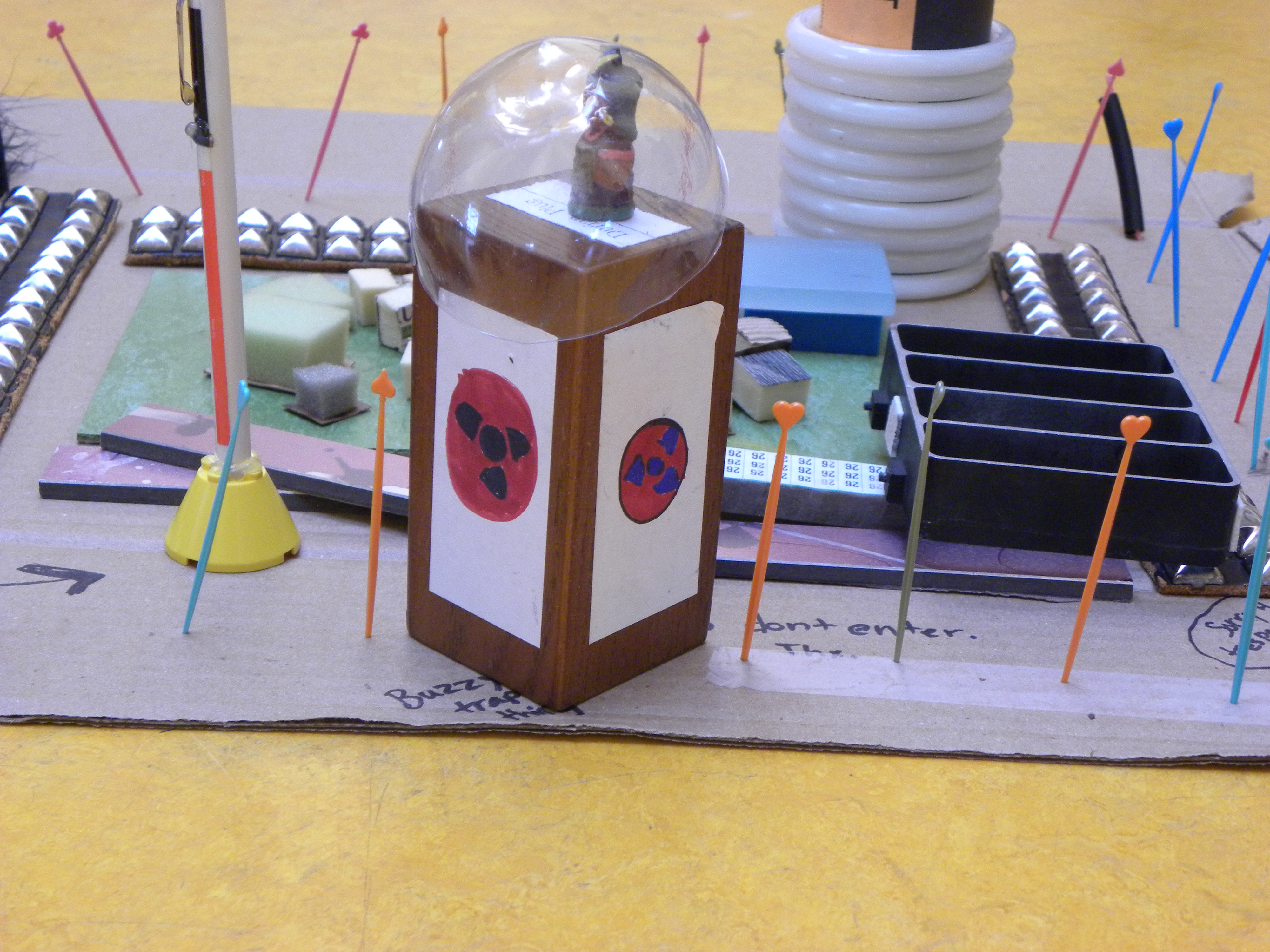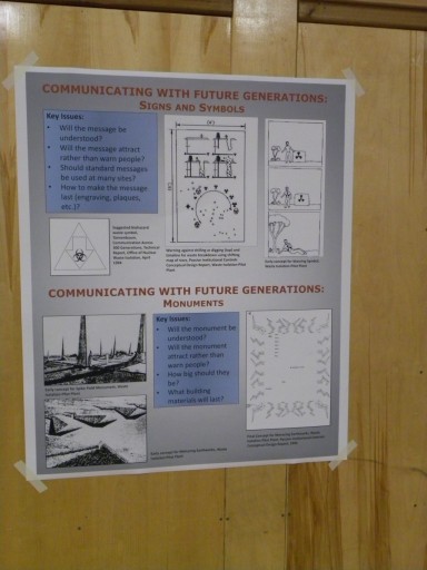 A lot of our thinking on this issue has been informed by the work done on communicating long term nuclear waste hazards at the Waste Isolation Pilot Plant (WIPP) in Carlsbad, New Mexico. You can get more information on the designs the WIPP group imagined to warn people away from the underground nuclear repository, and also read our full report (and two page summary) on how the WIPP ideas might be applied at Giant Mine.